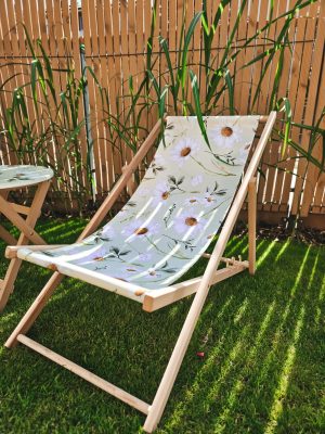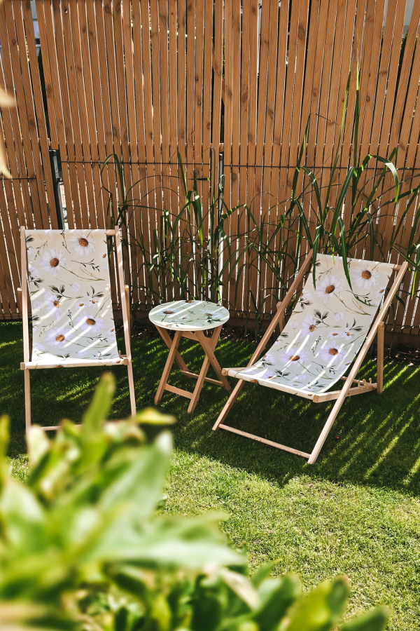 Wygodny i stylowy zestaw ogrodowy – Margaretki. W skład zestawu wchodzą dwa leżaki oraz okrągły stolik. Poręczny zestaw, łatwy w składaniu, może stanowić ozdobę ogrodu, balkonu, a także możecie zabrać go ze sobą na wakacje. Urocza kwiatowa grafika doskonale wkomponuje sie w krajobraz ogrodu i balkon. Zestaw może być wyjątkowym prezentem na wiele okazji tj. urodziny, imieniny, rocznica ślubu, ślub, przeprowadzka do nowego domu i wiele innych. Oferujemy możliwość personalizacji naszych produktów. Na życzenie możemy dodać dowolny tekst bądź grafikę stosowną do okazji na jaką chcesz podarować zestaw.